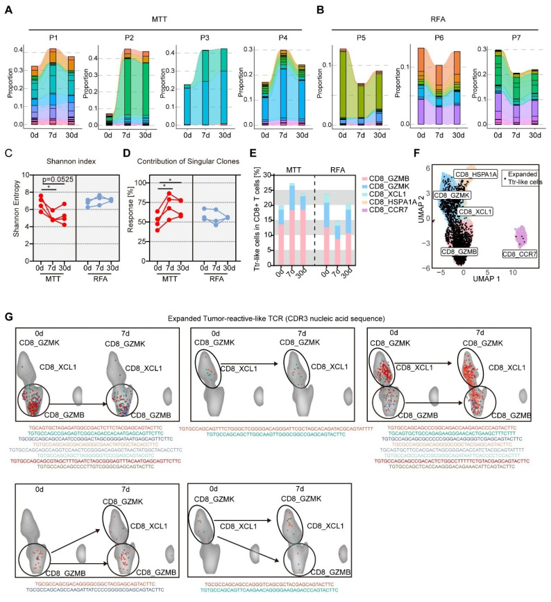 研究进一步通过单细胞TCR测序联合生物信息学分析,对其肿瘤反应性进行了系统验证。结果显示,外周血CX3CR1+GPR56+CD8+ T细胞与肿瘤内富集的肿瘤反应性T细胞(Ttr-like)共享高度同源的TCR序列,其TCR克隆型在肿瘤组织中存在显著扩增,证实该群细胞具备精准识别肿瘤抗原的核心特征。体外自体抗原共培养实验显示,CX3CR1+GPR56+ T细胞在接触肿瘤细胞后可大量分泌IFN-γ,证明其具备肿瘤特异性识别与应答能力。与此同时,研究通过TCR谱系追踪证实,多模态肿瘤治疗可显著驱动CX3CR1+GPR56+肿瘤反应性T细胞发生克隆性扩增,而这一现象在RFA组中并未出现,进一步说明CX3CR1+GPR56+ T细胞可能是介导多模态肿瘤治疗抗肿瘤免疫效应的关键功能性亚群。