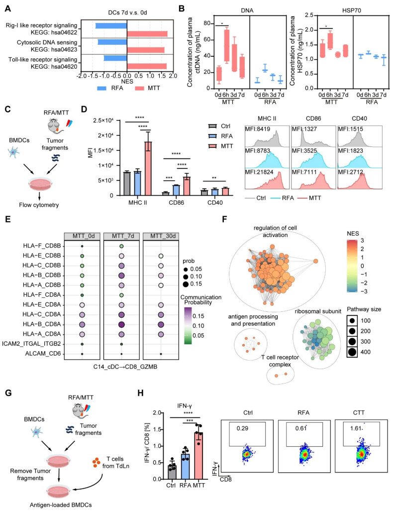 在此基础上,研究进一步解析了多模态肿瘤治疗驱动免疫重塑的分子机制。研究发现,多模态肿瘤治疗可诱导肿瘤细胞发生免疫原性死亡,大量释放热休克蛋白(HSP70)、胞外DNA等损伤相关分子模式(DAMPs),这些信号分子能够有效激活树突状细胞的Toll样受体(TLR)信号通路与胞质DNA感知通路,显著提升其抗原呈递能力。与RFA治疗相比,多模态肿瘤治疗后树突状细胞与CX3CR1+GPR56+效应T细胞之间的MHC-I-TCR相互作用显著增强,直接驱动肿瘤反应性T细胞的克隆扩增;同时,多模态肿瘤治疗可下调树突状细胞与Tregs之间的LGALS9-CD45信号轴,削弱Tregs的分化与免疫抑制功能。借助小鼠双侧肝癌模型,研究还证实局部多模态肿瘤治疗治疗能够触发系统性抗肿瘤免疫,重塑远端未治疗病灶的免疫微环境,增加效应T细胞与记忆性T细胞浸润,减少髓系来源抑制细胞(MDSCs)积累,从而诱导远隔效应。